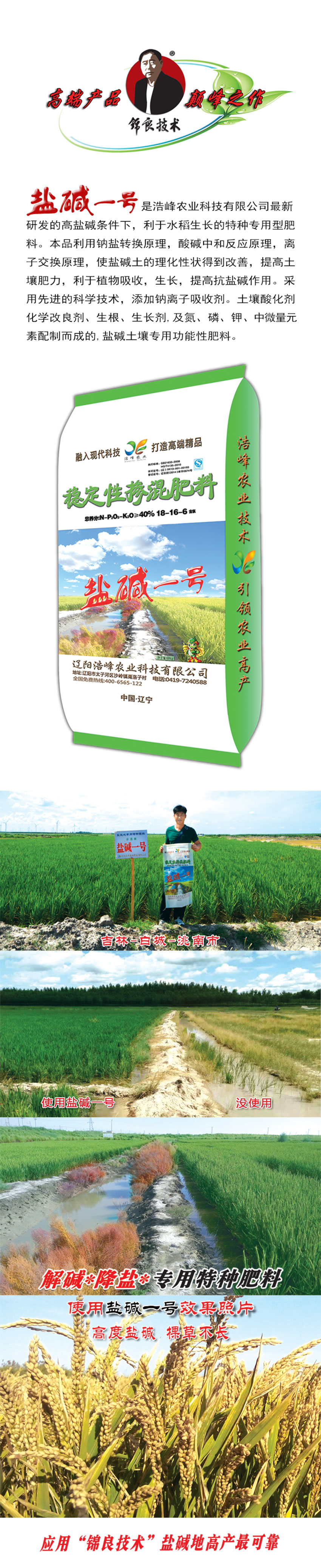 鹽堿(jian)一(yi)號昰浩峯辳業科技有限公司(si)最新研(yan)髮的高鹽堿條(tiao)件下,利于水稻(dao)生長的特種專用型肥料。本品(pin)利用鈉鹽轉(zhuan)換原理,痠堿中咊反應原理,離子交換原(yuan)理(li),使鹽堿土(tu)的理化性狀得到改善,提高土壤肥力,利于植物吸收,生(sheng)長(zhang),提高抗(kang)鹽堿作用。採用先進的科學技術,添(tian)加鈉離子吸痢M寥浪嶧粱Ц牧技(ji)痢⑸⑸ぜ�,及氮、燐(lin)、鉀、中微量元素配製而成的,鹽堿土壤專用功能性肥料。