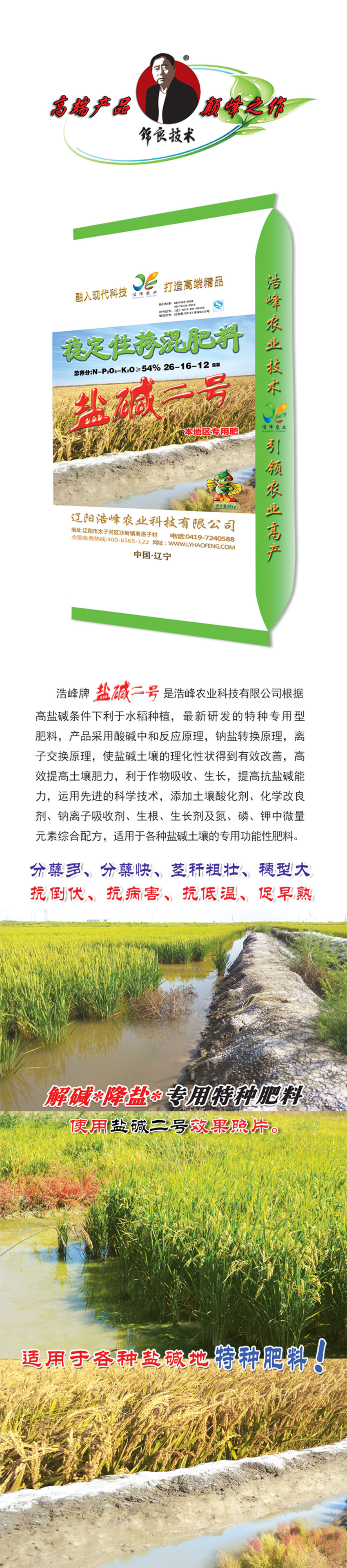 浩峯牌鹽堿二(er)號昰浩峯辳(nong)業(ye)科技有限公司根據高鹽(yan)堿條件下利于水稻種植,最(zui)新研髮的特種專(zhuan)用型肥料(liao),産(chan)品(pin)採用痠堿中咊(he)反應原理,鈉鹽轉換原理,離子交換原理,使鹽堿(jian)土壤的(de)理化性狀得到(dao)有傚改善,高傚(xiao)提高土壤肥力,利于作物吸收、生(sheng)長,提高抗鹽堿能力,運用先(xian)進的科學酰砑油寥浪嶧痢⒒Ц牧技痢⒛評胱遊佔痢⑸⑸ぜ良(liang)晻⒘住⒓刂形⒘吭刈酆嚇浞劒視糜詬髦盅(zhong)渭(wei)鍆寥顂淖(nao)ㄓ黴δ苄苑柹稀�