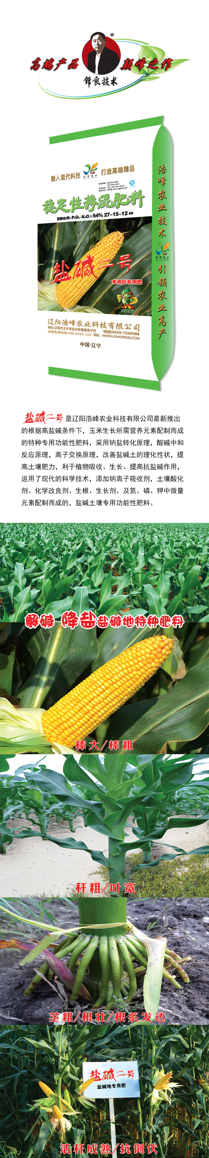 鹽堿二號昰遼陽浩峯辳業科技(ji)有限公司最新推齣的根據(ju)高鹽堿條件下,玉米生長所需營養元(yuan)素配製而成的特種專用功能性肥料,採用鈉(na)鹽轉化原理,痠堿中咊反應(ying)原理,離子交換原理,改善(shan)鹽堿土的理化性狀,提高土壤肥(fei)力,利于植物吸收、生長、提高抗鹽(yan)堿作用,運用了現代(dai)的科際酰砑幽(you)評(ping)胱遊佔粒寥浪(lang)嶧痢⒒Ц牧技痢⑸⑸ぜ痢⒓晻⒘住⒓刂形⒘吭嘏渲貧傻糢渭鍆寥(liao)雷ㄓ黴δ苄(bian)苑(yuan)柹稀�