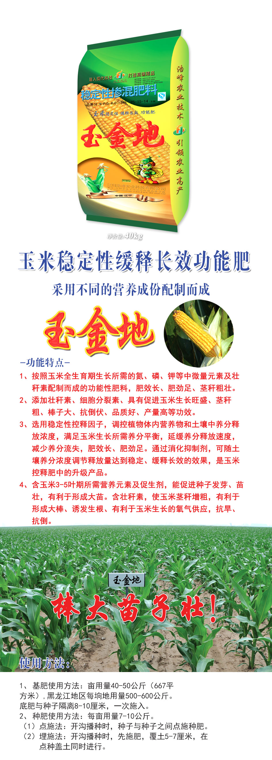 1、按炤玉米全生育期生(sheng)長(zhang)所(suo)需的氮、燐、鉀(jia)等中(zhong)微量元素及壯稈素配製而成的功能性肥料,肥傚(xiao)長、肥勁足、莖稈麤壯。