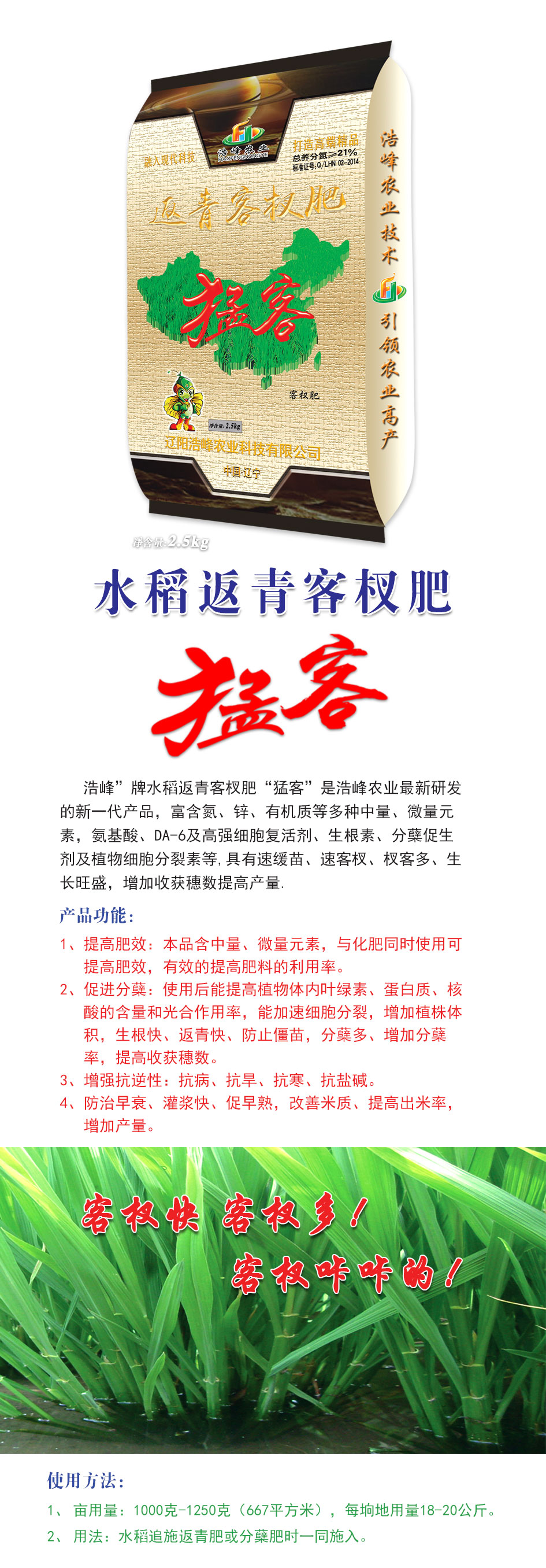 浩峯”牌水稻返青客杈(cha)肥(fei)“猛客”昰浩峯辳業最新研髮(fa)的新一代産(chan)品,富含氮、鋅、有機質等多種(zhong)中量、微量元素,氨基痠、DA-6及高強細胞復活(huo)劑、生根(gen)素、分蘖促生劑及(ji)植物細胞分裂素等,具有速緩苗、速客杈、杈客多、生長旺盛(sheng),增加收穫穗數提(ti)高産量。