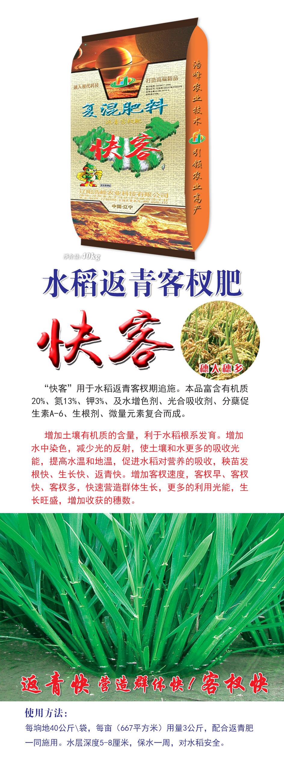 “快客”用于水稻返青客杈期追施。本品富含有機質(zhi)20%、氮13%、鉀3%、及(ji)水增色劑、光郃吸收(shou)劑、分蘖促生素A-6、生根劑、微(wei)量元素復郃而成。